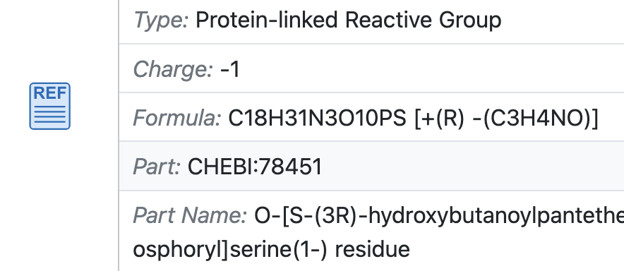 When the full formula and/or structure of a component is not known, or not practical to include, components can be defined as a component with a spefic reactive group. This is often the case for reactive groups on proteins or DNA. Since it is often subjective which exact part of the molecule is the reactive group, there is some freedom built into BiGGr for these molecules. When a universal component represents a complex metabolite, the default component has a formula equal to the formula of the reactive part as defined by its reference. Additional components with differnt formulas can be created under the same universal component. BiGG IDs of these components follow the format <universal_id>:<variant><charge>, where the variant is represented by a capital letter (e.g. dnac:A-1).