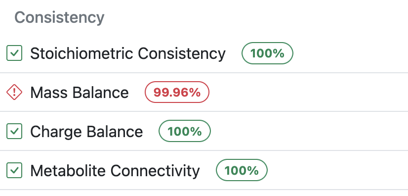 MEMOTE is a suite of tools that can be used to analyze various aspects of model quality. This test suite is now automatically executed for all models in BiGGr. The results can be found on each model page. Whenever MEMOTE results pertain to specific model metabolites or reactions, the results are also displayed on those respective pages.