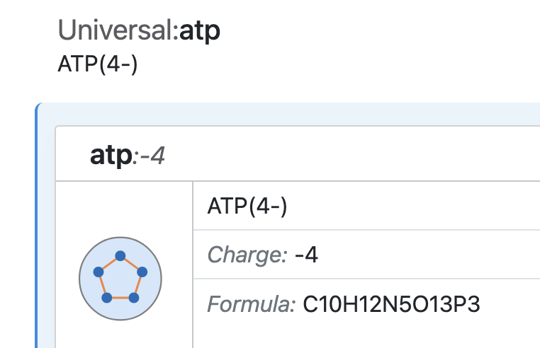 Universal Component have BiGG IDs that are human-readable shorthand forms of their name (e.g. atp). Components can be explicity referred to using the BiGG ID of the universal component and the charge of the component, separated by a colon (e.g. atp:-4). In practice, the charge can often be omitted in the BiGG ID, since charge is a property of metabolites in SBML models. In the rare case when one would like to use two different components that share the same universal component in a single model, the charge should be explicitly specified in the identifier.