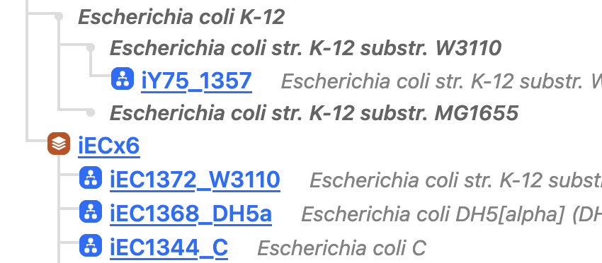 A Model represents an entity that combines metabolites, reactions, and genes into a form that can be used to model aspects of an organism or tissue or group thereof. In BiGGr, Models are members of a Collection. Collections group models that were constructed in the same research, pipeline or manuscript together. In cases where a single model was constructed in a specific research, the models still belong to a distinct collection, but this collection is often omitted (e.g. in the new collections page). The BiGG IDs of models should still be globablly unique, i.e. a model can always be accessed by its BiGG ID alone, without the necessity of knowing the collection BiGG ID.