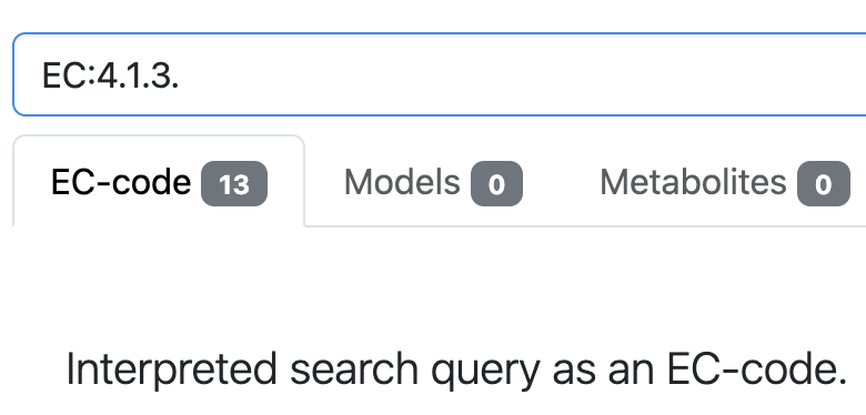 In addition, BiGGr search will recognize many types of external identifiers and return the relevant BiGGr entities. For a full list and examples of searching by external identifier, click the search box/button at the top of the page.